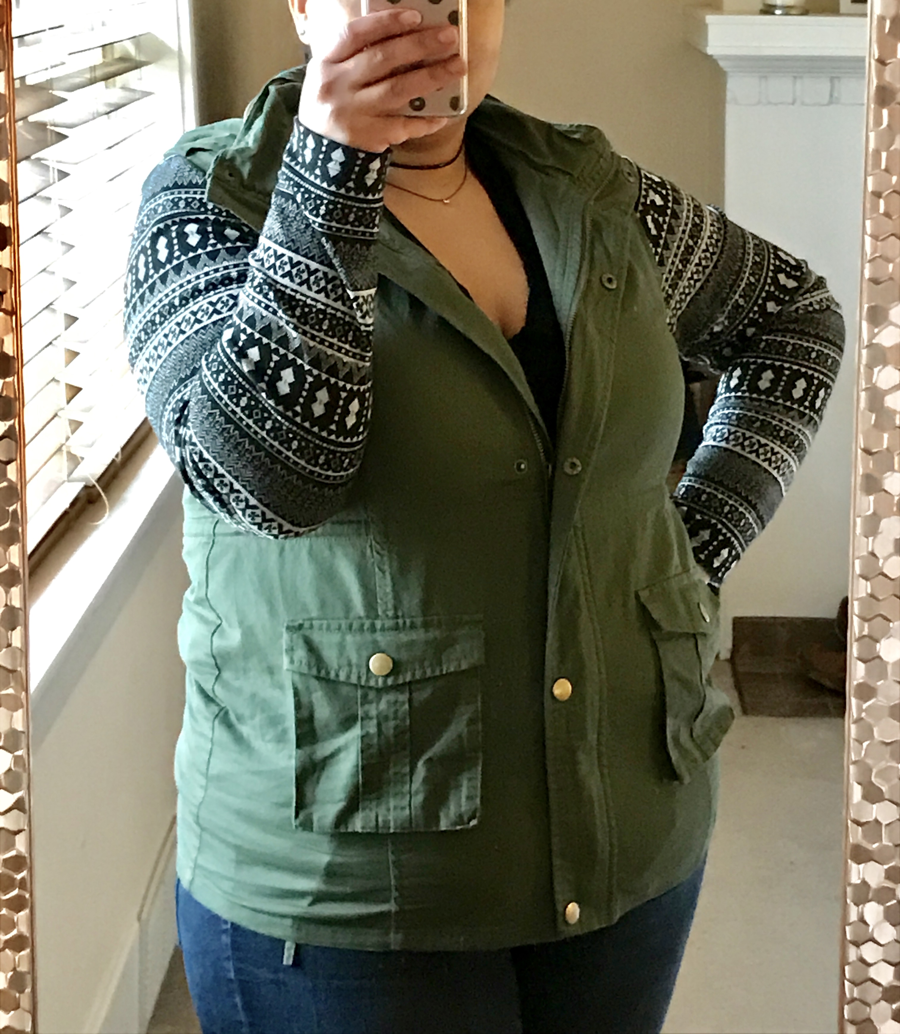 This was an unexpected piece. I haven’t really received anything like this in the past and things that might have been similar I have usually sent back because the pattern was either too much or the jacket/coat was not terribly flattering. I kind of loved the sleeves on this. Were it not for the sleeves I might hate the jacket because the color kind of said camo/military to me. The sleeves were definitely a cute detail and made it feel feminine. This jacket has a hood with the option of folding it up and zipping it away. I also like how the jacket is structured and has a drawstring in the middle for additional tightening/loosening as needed. Perfect jacket for transitioning in to spring and could see it working well as you transition in to fall as well.